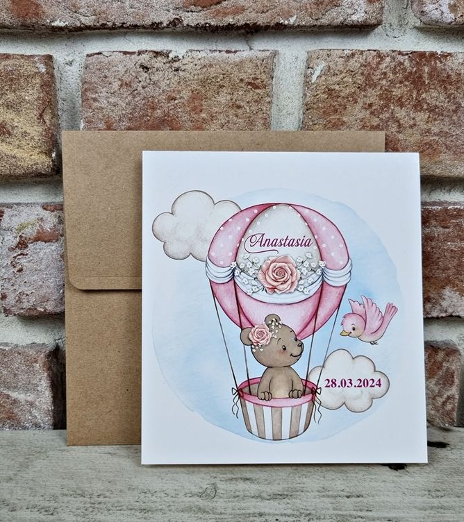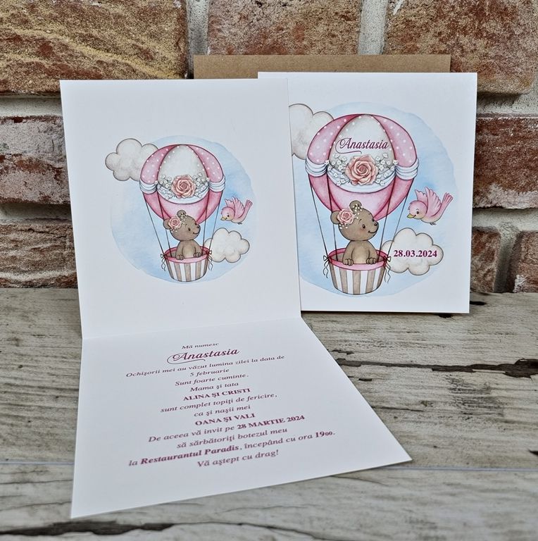 Descriere: cod - 602 Invitatie de botez pentru fetite din carton alb cu ursulet in balon Plicul este kaki Pretul contine plic, TVA iar inscriptionarea este de 0,80 lei/buc Montajul este optional = 0,15 lei/buc
