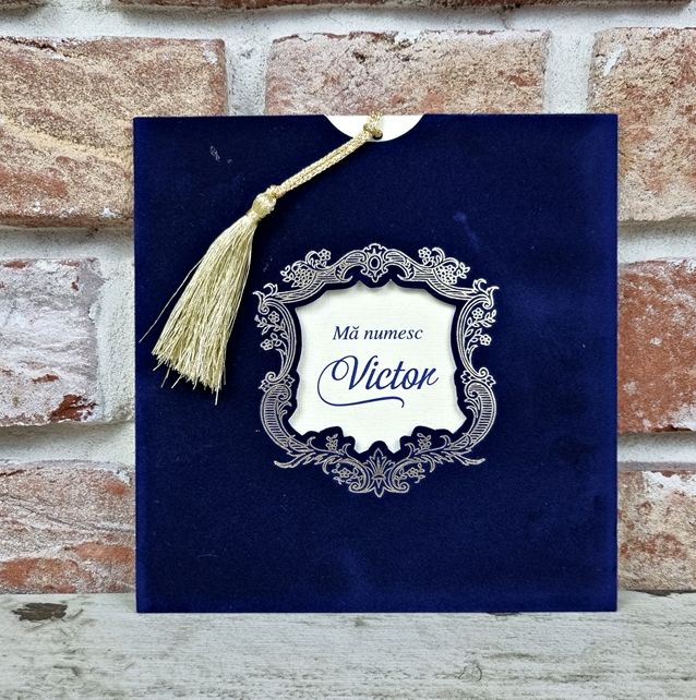 Plicul este tip buzunar din catifea bleumarin