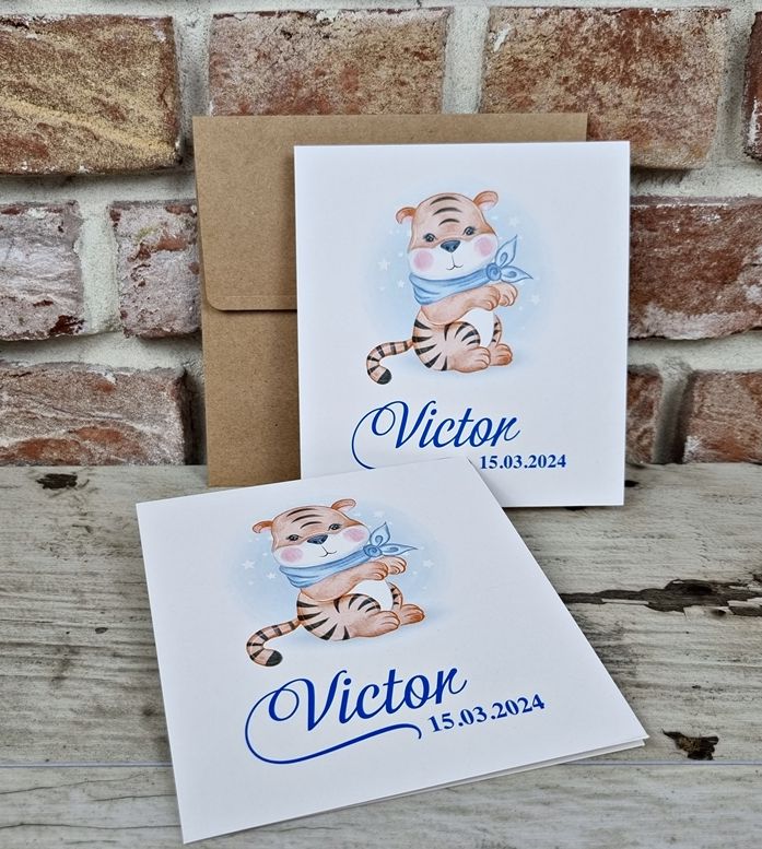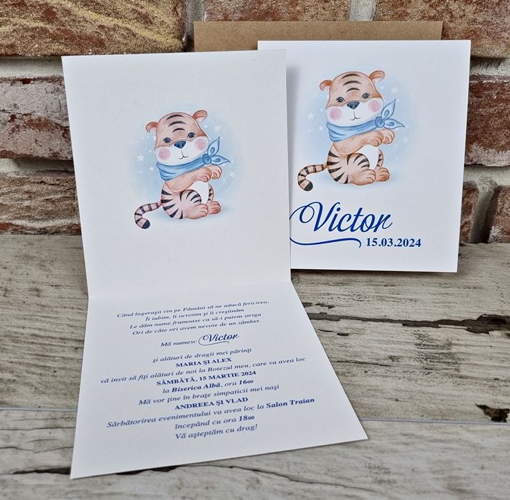 Descriere: cod - 605 Invitatie de botez cu tigru Plicul este kaki Pretul contine plic, TVA iar inscriptionarea este de 0,80 lei/buc Montajul este optional = 0,15 lei/buc