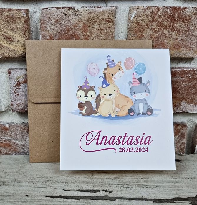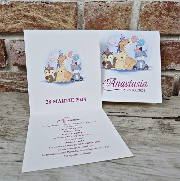 Descriere: cod - 604 Invitatie de botez cu amimalute la petrecere Plicul este kaki Pretul contine plic, TVA iar inscriptionarea este de 0,80 lei/buc Montajul este optional = 0,15 lei/buc